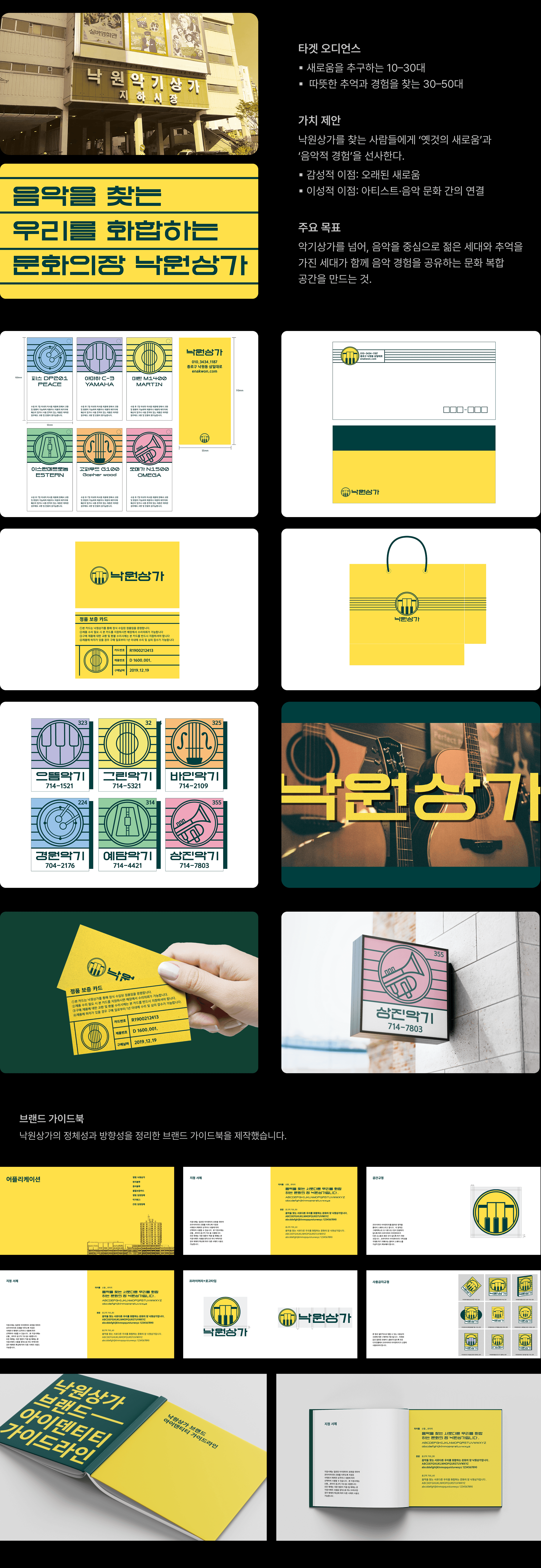 서울의 상징적인 악기 상점가인 낙원상가를 위한 리브랜딩 제안입니다. 노후된 상가라는 인식을 넘어, 음악을 매개로 세대 간의 추억과 젊은 에너지가 공존하는 새로운 복합문화공간으로 재해석했습니다. 과거의 헤리티지를 보존하면서도 현대적인 감각이 조화롭게 어우러지는 브랜드 시스템을 설계했습니다.