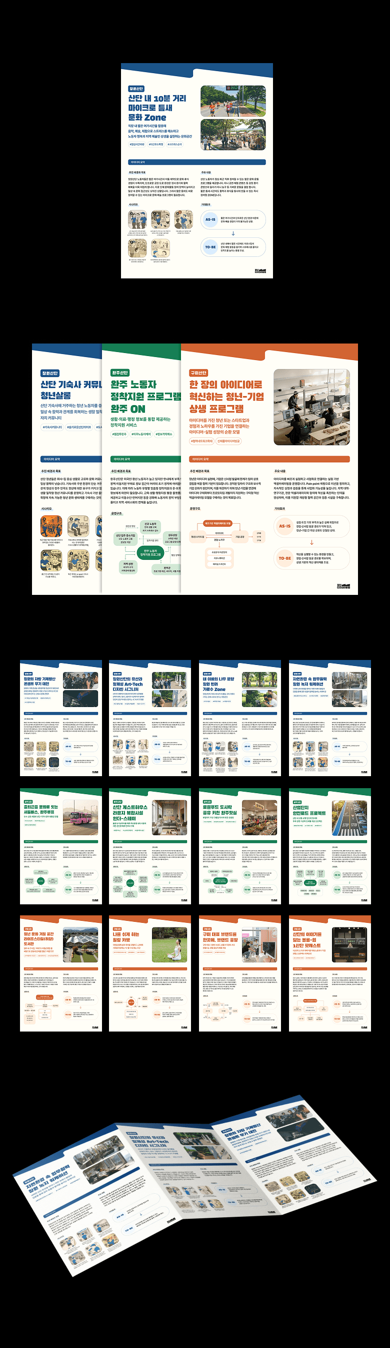 디자인진흥원의 ‘청년 디자인 리빙랩’ 프로젝트의 아이디어 시각화해 디자인했습니다. 복잡한 기획 내용을 구조화해 가독성 높은 디자인으로 정리하고 판넬·리플렛으로 인쇄했습니다.