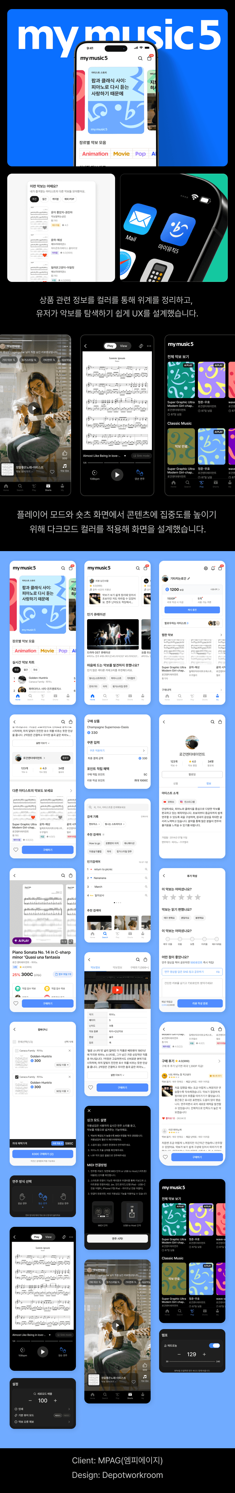 악보를 판매하는 브랜드 ‘마이뮤직5’의 앱을 디자인했습니다. 커머스의 특성을 반영해 정보의 위계를 명확히 정리해 사용자가 쉽게 악보를 탐색하고 구매할 수 있도록 설계했습니다. 또한 플레이어, 콘텐츠, 숏츠를 포함한 슈퍼 앱이기에, 해당 기능과 화면을 통합할 수 있는 디자인 규칙을 정립했습니다.